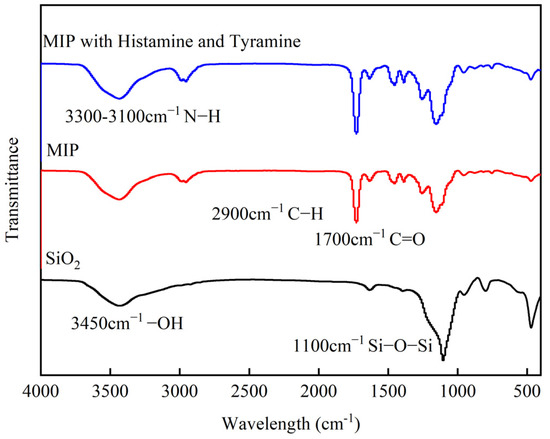 Figure 2 illustrates the infrared spectra of SiO2, MIP, and MIP with bioamine. In all spectra, characteristic absorption peaks at wavenumbers 1100 cm−1 (Si-O-Si) and 3450 cm−1 (-OH) confirm the existence of SiO2 microspheres [32]. Compared to SiO2, the peaks at 2900 cm−1 and 1700 cm−1 correspond to C-H and C=O stretching vibrations in EGDMA [33], respectively, indicating the successful synthesis of imprinted polymers. After bioamine adsorption by MIPs, the transmittance of broad absorption peaks in the range of 3300–3100 cm−1 decreased, which can be attributed to the N-H [34] stretching vibrations of bioamines, further validating the successful preparation and effective adsorption capacity of the imprinted polymers.