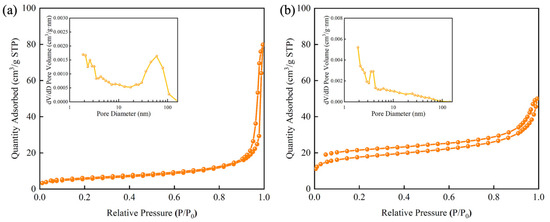 According to the nitrogen adsorption–desorption isotherms of SiO2 and MIPs (Figure 3), both materials exhibit Type IV [35] isotherm behavior. In the low-pressure region (P/P0 < 0.1), the adsorption capacity of MIP is significantly higher than that of SiO2, indicating a higher micropore volume and a larger specific surface area [36] in MIP. This enhanced microporosity directly contributes to the increase in the total surface area of MIP. From the analysis of the nitrogen adsorption–desorption isotherms, the BET surface area of SiO2 is 19.88 m2/g, and the BET surface area of MIP is 65.07 m2/g.