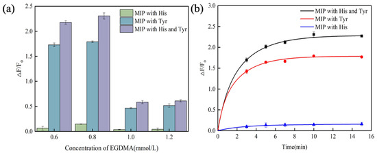 The impact of EGDMA concentration on the fluorescence response of CdSe/ZnS-MIP (a). The effect of detection time on CdSe/ZnS-MIP (b). (His and Tyr: abbreviations for histamine and tyramine).