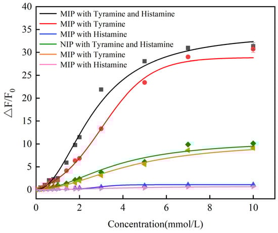 As previously discussed in Section 3.3, MIP exhibits a higher adsorption capacity for tyramine compared to histamine, while CdSe@ZnS quantum dots demonstrate a stronger fluorescence response to histamine relative to tyramine. Consequently, regarding histamine detection, although the response value of NIP to the bioamine mixture solution is higher than that of MIP to histamine alone, the overall response of NIP to histamine remains lower than that of MIP.