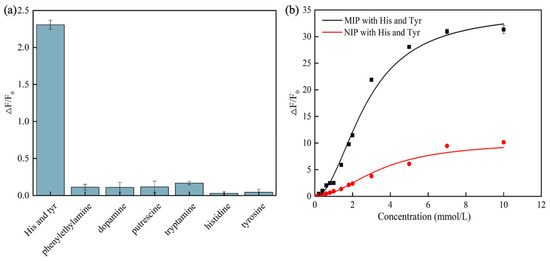 The aim of the selective recognition experiment was to evaluate whether the molecularly imprinted polymer (MIP) could effectively distinguish and specifically adsorb target molecules while exhibiting minimal interaction with other biogenic amines and structural analogs. Under identical detection conditions, the adsorption performance of CdSe/ZnS-MIP was assessed for the mixed solution of histamine and tyramine as well as their structural analogs, including tryptamine, dopamine, phenylethylamine, putrescine, histidine, and tyrosine. As illustrated in Figure 6a, at the same concentration, the fluorescence response of CdSe/ZnS-MIP to the histamine–tyramine mixture was significantly stronger compared to its responses to tryptamine, dopamine, phenylethylamine, putrescine, histidine, and tyrosine. This result demonstrates the high selectivity of the sensor. This phenomenon can be attributed to the absence of specific imprinted cavities or recognition sites on the surface of CdSe/ZnS-MIP that could bind to these structural analogs, leading to negligible fluorescence enhancement. This marked difference further validates the superior selectivity of CdSe/ZnS-MIP in detecting histamine and tyramine.