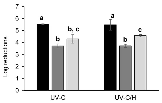 Log reductions in E. coli cocktail (■), yeast cocktail (■) and A. acidoterrestris spores (■) achieved in isotonic sports drink processed by single UV-C (892 mJ/cm2, 20 ± 1 °C) or assisted by mild heat (534 mJ/cm2, 50 ± 1 °C; UV-C/H). One-way ANOVA with post hoc Tukey’s HSD test; different letters above the bars indicate statistically significant differences (p < 0.05). Standard deviation (I).