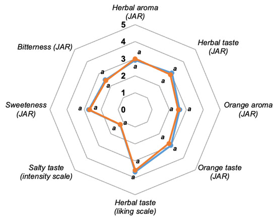 The questionnaire used in this study was performed in a special session by a group of eight trained members, following the guidelines established by Lawless and Heymann [32]. In the consumer field test, the panelists (117) initially evaluated the overall acceptability of the samples on 9-point hedonic scales. Then, the attributes were measured using 5-point acceptability, intensity or just-about-right (JAR) scales. The evaluated attributes included herbal aroma and herbal taste, as well as orange aroma, orange taste, salty taste, bitterness and sweetness. The herbal taste was measured using liking and adequacy (JAR) scales, while saltiness was evaluated on an intensity scale. Finally, the panelists measured the adequacy (JAR) of the attributes of herbal aroma, orange taste, orange aroma, bitterness and sweetness.
