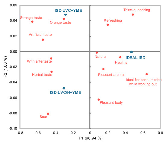 Although Cochran’s test indicated no significant differences between ISD-UVC+YME and ISD-UVC/H+YME, the panelists detected some terms as more pronounced in one sample than in the other. For instance, the UV-C+YME isotonic drink was associated with artificial, orange and strange tastes. The UV-C/H+YME sample showed negative values on both axes and was described by the panelists as having herbal and sour tastes and with an aftertaste. These findings suggest that applying UV-C light for more than 20 min may impart to the sample a strange taste, while using mild heat (50 °C) to assist a shorter UV-C treatment prevents those changes, making the herbal taste of the added extract more noticeable. Conversely, the ideal ISD was described as natural, with a pleasant body, refreshing, healthy, thirst-quenching and ideal for consumption while working out. It should be noted that the term astringent was omitted from the CA, since no significant differences were found in its frequency of mention after applying Cochran’s Q test.