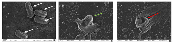 The treatment effect on AA can be observed in SEM and TEM images. Figure 4 corresponds to images obtained by SEM that display the morphological changes in A. acidoterrestris spores before and after the UVC/H treatment (534 mJ/cm2, 50 ± 1 °C). The untreated spores presented intact membranes with regular contours in their shape. They exhibited a slightly rough surface (Figure 4a, tagged with white arrows). In contrast, AA spores treated with UV-C/H showed a notably increased roughness on their surface (Figure 4b, marked by a green arrow) and a loss of their structural integrity, with a central depression, even hollows (Figure 4c, marked by a red arrow), as a result of damages induced by UV-C radiation.