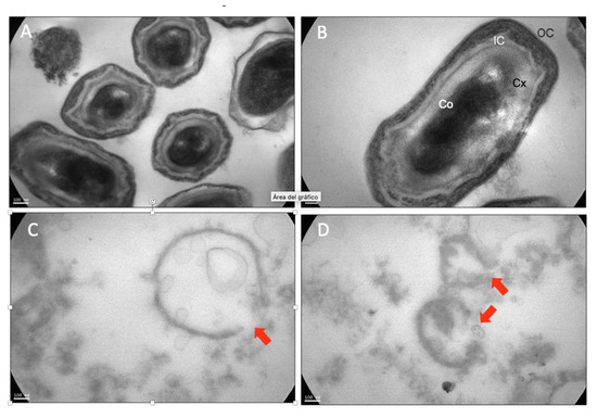 For TEM, the samples were washed with phosphate-buffered saline (PBS), centrifuged at 1475× g for 5 min, and the resulting supernatant was removed. The pellet was resuspended in a solution of 2% glutaraldehyde for 24 h at 5 °C to preserve the morphology and structure of the spores, rinsed with 0.1 M phosphate buffer and post-fixed with 1% OsO4 in 0.1M phosphate buffer for 17 h at 4 °C. After fixation, samples were washed with distilled water, dehydrated with alcohol series and embedded in Durcupan (Sigma-Aldrich, USA). Ultrathin sections stained with lead citrate and uranyl acetate were examined using an Electron Microscope Zeiss EM 109T (Lanais-Mie, UBA-CONICET, Buenos Aires, Argentina). Magnification ranging from 85,000× to 140,000× for sizes around 50–100 nm was applied. Untreated cells were subjected to a similar fixation procedure and served as controls.