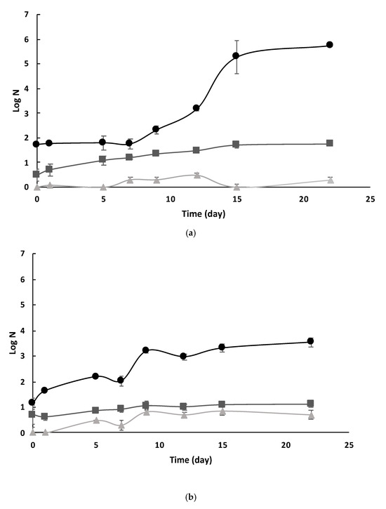 Evolution of native microbiota in ISD-C (●), ISD-UVC/H (▲) and ISD- UVC/H+YME (■) samples during refrigerated storage (4 ± 1 °C). Aerobic mesophiles (a), molds and yeasts (b). Standard deviation (I).