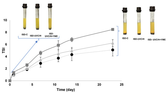 The Turbiscan Stability Index (TSI) is a dimensionless number that allows for a quick and robust quantification and comparison of the evolution of the sample destabilization phenomenon. ISD-C, ISD-UVC/H and ISD-UVC/H+YME were evaluated over 23 days in cold storage to study product destabilization during shelf life. Figure 7 depicts the evolution of TSI values over time. The samples were unstable during storage, with particle migration resulting in sedimentation. ISD-UVC/H+YME was the least stable suspension, exhibiting a higher slope and TSI values. The primary factor leading to sedimentation is particle density. Adding YME increased the density of solids, resulting in a higher gravitational force and, consequently, a faster sedimentation rate. However, this may not be entirely negative, as a precipitated solution can be a typical characteristic of this type of drink.