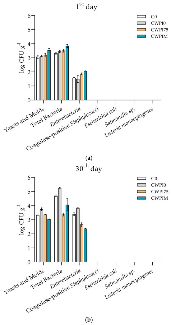 Number of microorganisms (log CFU g−1) in the control cheese (C0) and samples with WPI-based coatings (CWPI0, CWPI75, and CWPIM) on the 1st (a), 30th (b), and 60th days (c). There was no statistical significance between samples (one-way ANOVA—Dunnett’s test, p ≤ 0.05).