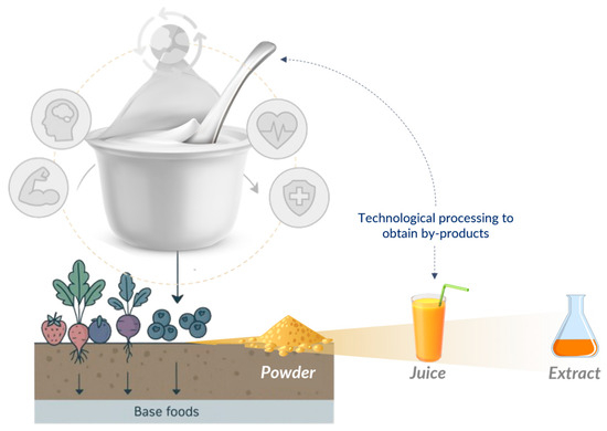 However, it has been found that the supply of bioactive compounds, such as phenolics, flavonoids, anthocyanins, etc., imposes certain limitations on the functional properties of natural yogurt [52,53,54], which makes this product a target for industrial desires to incorporate elements and add value. In this context, the enrichment of yogurts with natural functional ingredients has gained prominence in the scientific community [15], where the addition of these compounds to dairy products can occur through the direct inclusion of ingredients rich in these substances, such as jellies, purees, pulps, flours, or powders obtained from primary products and by-products of the processing of fruits, vegetables, and spices. From a commercial point of view, yogurt stands out as one of the most versatile foods, presenting high compatibility with various ingredients. This characteristic not only increases its acceptance by the consumer but also opens space to enhance its nutritional benefits, favor biological activity, and improve its technological and commercial standards (Figure 1).