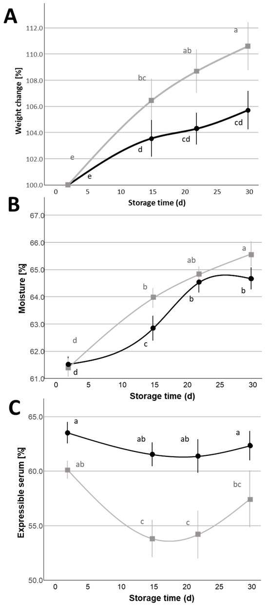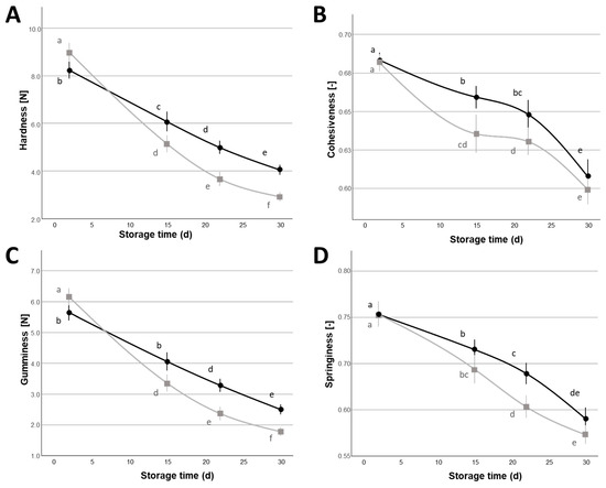 = 2%) during the 30 d refrigerated storage. Different letters indicate significant within-group differences (p < 0.05) based on LSD post hoc test.