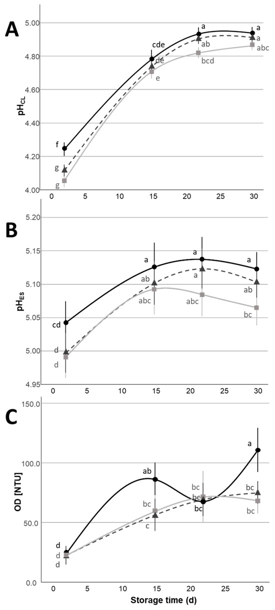 pH of covering liquid (pHCL) (A), of expressible serum (pHES) (B), and optical density of covering liquid (C) variation (Mean ± Standard Error, n = 16) of Mozzarella di Bufala Campana PDO cheeses with covering liquids with different organic acids (