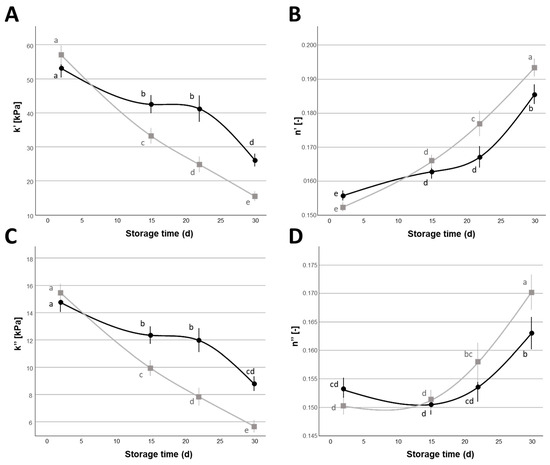 Also, the rheological parameters k′ and k″, which indicate the quantity of the rheological moduli G′ and G″ at 1 rad s−1, showed a similar decrease during the refrigerated storage (Figure 4A,C). The rheological parameters n′ and n″, which indicate the frequency dependence of the moduli and are related to the type and strength of interactions that form the casein network [24], showed an increase during refrigerated storage (Figure 4B,D), which is indicative of a lowering of the internal bonds of the network. These rheological modifications were also coherent with previous reports made on Italian high-moisture Mozzarella cheese [38], which observed a decrease in k′ and k″ and an increase in n′ and n″ values over a 10 d refrigerated storage period. These textural and rheological changes can be directly influenced by the increase in moisture of the cheeses and to casein swelling phenomena during refrigerated storage. Moderate correlation coefficients between MC, hardness, and gumminess (r = −0.417 and −0.399, respectively, p < 0.01) or MC, k′, and k″ (r = −0.414 and −0.390, respectively, p < 0.01) support the relationship between moisture increase and partial destabilization of the cheese structure (Table S1). As is well known, water exerts a plasticizing effect on the physical domain formed by the casein network, thus decreasing the gel strength [25,52]. Also, proteolysis, which may be primarily caused by the activity of plasmin, and to a lower extent by rennet residual activity or by the activity of microbial exogenous proteases, may contribute to this decrease [14,22,35]. Finally, the mineral equilibria of Ca and P between the colloidal and soluble phase, which are influenced by the presence of NaCl and the pH, can influence the rheological properties of the cheese, since a reduction in colloidal calcium phosphate is often associated with a reduction in stiffness and a loss of structural integrity of the casein network [39,44].