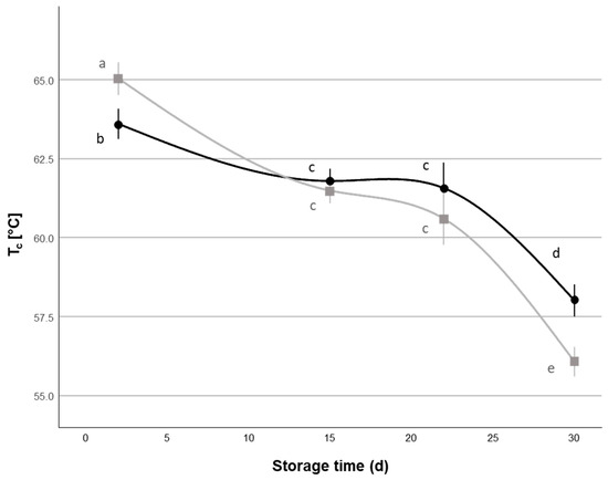 In particular, in this case, the effects that the percentage of NaCl in the covering liquid had on cheese meltability may be directly linked to the changes in protein hydration and voluminosity, which may decrease the distance between protein fibers, enhance protein–protein interactions, and thus decrease cheese meltability [25,31,56]. Accordingly, Tc values were significantly correlated with the MC of the cheeses (r = −0.372, p < 0.01) (Table S1).