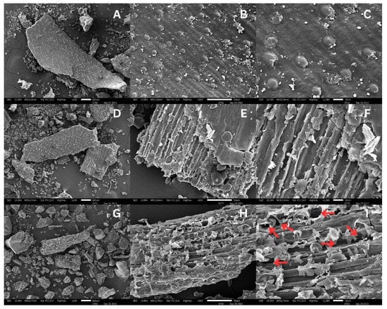 SEM images showing BSG characteristics with different treatments: untreated sample (A) 100×, (B) 500× and (C) 1000×; ALK-treated sample (D) 100×, (E) 500×, and (F) 1000×; and PEF-treated sample (G) 100×, (H) 500×, and (I) 1000×. The red arrows indicated the PEF-induced pores.