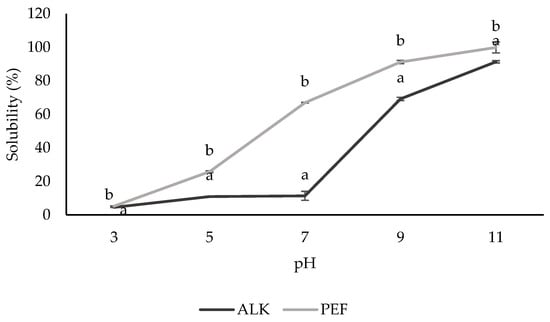 Solubility of BSG protein concentrates prepared by alkaline (ALK)- and pulse electric field (PEF)-assisted extraction. Data are expressed as mean ± SD. Different lowercase letters (a, b) indicate significant differences (p < 0.05).