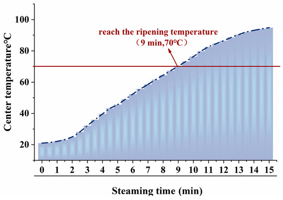 During the steaming process, the core temperature of the fish reflects the degree of heat exchange between the steam and the fish, which is closely related to the quality characteristics and flavor changes of the fish. According to the national standard GB 31654-2021, the core temperature of food requiring thorough cooking should reach above 70 °C during processing [18]. As shown in Figure 1, during steaming, the core temperature of the fish gradually increased over time. High-temperature steam transfers heat from the exterior to the interior through thermal convection, but the initial increase in the core temperature is slow [19]. As the steaming time increases, heat continues to transfer to the interior, and the core temperature rises rapidly, reaching 70 °C at 9 min.