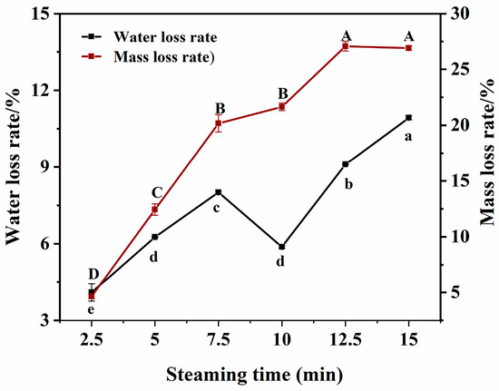 Water loss rate and weight loss rate of pufferfish meat at the different steaming durations. Different uppercase letters (A–D) indicate significant differences in the mean mass loss rate (p < 0.05); different lowercase letters (a–e) indicate significant differences in the mean water loss rate (p < 0.05).
