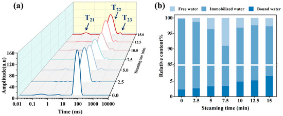 Effects of different steaming times on water distribution in pufferfish meat. LF-NMR curve (a) and relative content of three water states (b) in pufferfish meat under different steaming times.