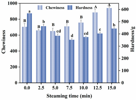Effect of the different steaming durations on the texture of pufferfish meat. Different uppercase letters indicate significant differences in mean chewiness (p < 0.05); different lowercase letters indicate significant differences in hardness (p < 0.05).