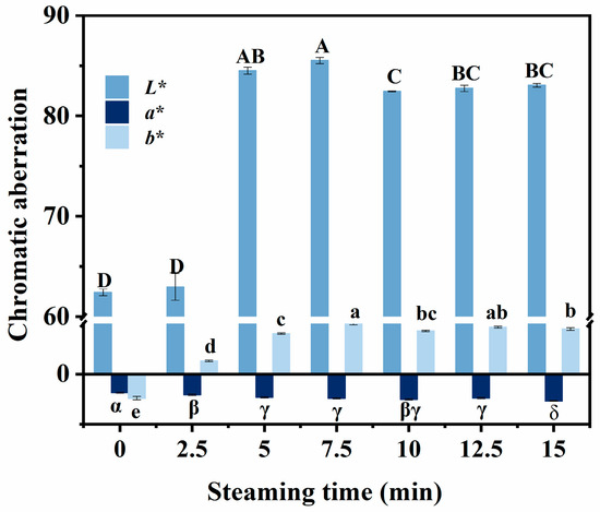 Effect of the different steaming durations on the color of pufferfish meat. Different uppercase letters (A–D) indicate significant differences in L* values (p < 0.05); different lowercase letters (a–e) indicate significant differences in b* values (p < 0.05); different alphanumeric symbols (α–δ) indicate significant differences in a* values (p < 0.05).