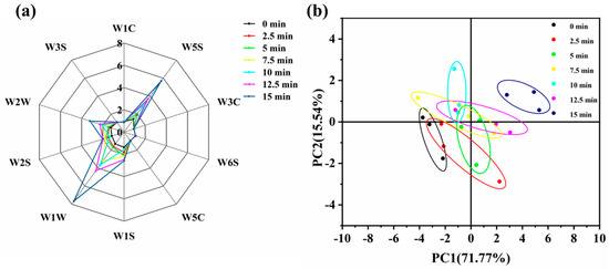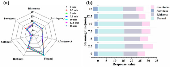 The results of the e-nose radar chart are shown in Figure 8a. As the steaming time increased, the response values of the samples for sensors W5S, W1W, and W2W increased significantly, with the highest response being observed at 15 min. This indicated that prolonged steaming enhanced the contribution of nitrogen oxides, sulfides, aromatic compounds, and organosulfides to the overall aroma of the samples. When compared to the fresh samples, steaming resulted in a greater abundance of volatile flavor compounds.