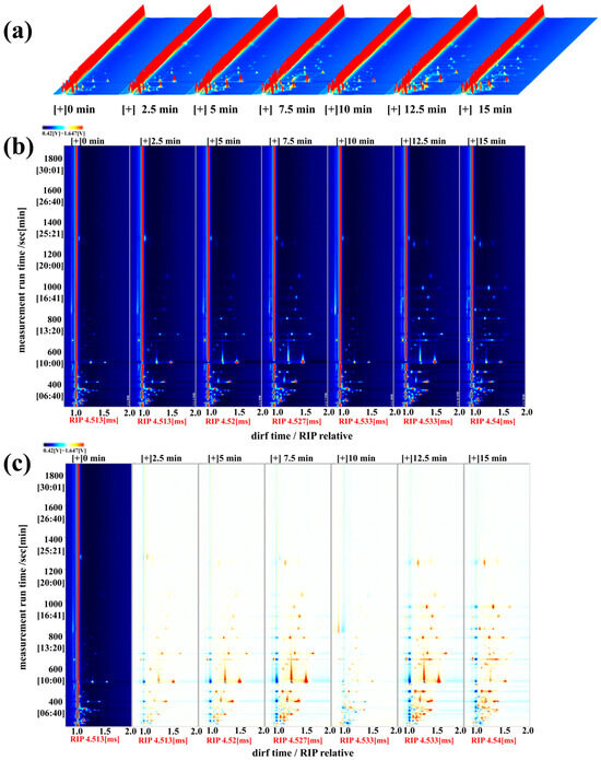 Effect of steaming duration on the volatile compounds in puffer fish meat. 3D (a) and 2D (b) gas chromatography-ion mobility spectrometry profiles and difference plot (c) of volatile compounds in puffer fish meat.