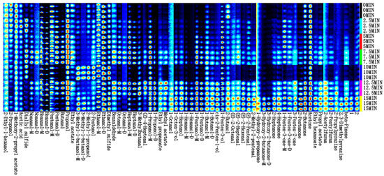 The changes in the volatile compounds during the steaming process were further analyzed, and the resulting flavor fingerprints are shown in Figure 10. The color depth and area size of the points reflect the relative concentration of the compounds, with darker colors and larger areas indicating higher concentrations, and vice versa [16]. As shown in Figure 10, steaming time significantly affected the signal intensity of volatile compounds in fish meat, reaffirming that steaming markedly increased the variety and content of volatile flavor compounds. The fluctuations in the types and contents of volatile flavor compounds during steaming may be closely related to chemical processes such as lipid oxidation [53]. Among the volatile compounds generated after steaming, ketones and aldehydes were predominant, which was consistent with the electronic nose analysis results.