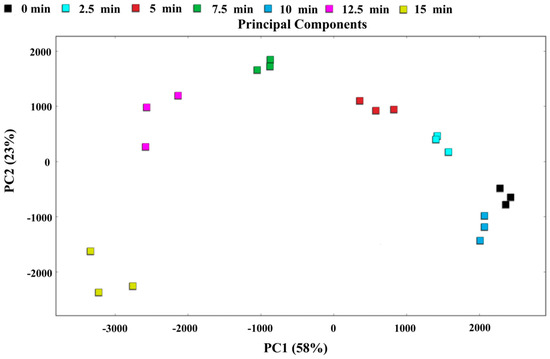 PCA is an efficient dimensionality-reduction technique that can intuitively present differences among various samples using a PCA score plot. In this study, we conducted a systematic PCA of 55 volatile flavor compounds in T. flavidus samples steamed for different durations. As shown in Figure 11, the PCA plot illustrates the differences in the composition of volatile flavor compounds in fish meat at various steaming times. The results indicate that the first principal component (PC1) accounted for 58.00% of the variance, while the second principal component (PC2) accounted for 23.00%, with a cumulative contribution rate of 81.00%. This suggests that the selected principal components adequately represent most of the original variable information for the volatile compounds [55].