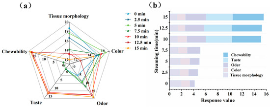 Effect of steaming duration on the sensory evaluation in puffer fish meat. Sensory radar (a) and stacked chart (b) of pufferfish meat.
