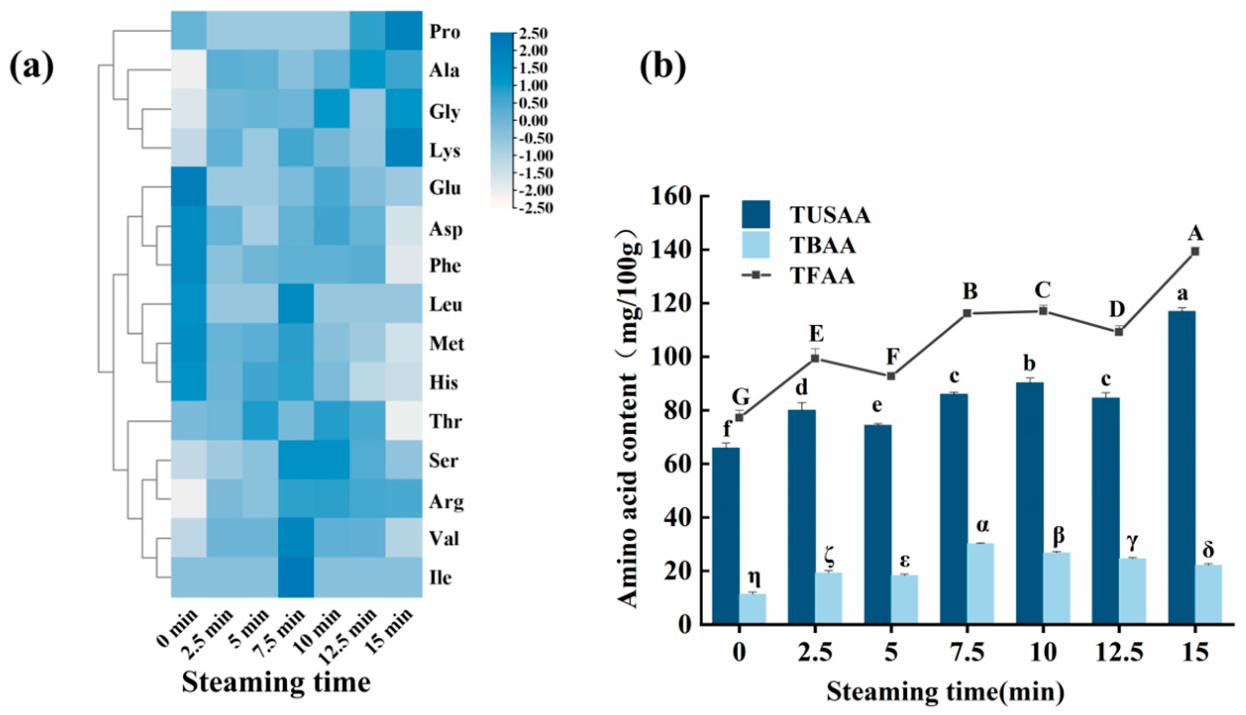 Effect of steaming duration on the content of free amino acids in puffer fish meat. Heatmap of 16 free amino acids under different steaming times (a) and changes in TFAA, TUSAA, and TBAA (b). TUSAA represents the total content of umami and sweet amino acids; TBAA denotes the total content of bitter amino acids; TFAA stands for the total free amino acid content. Different uppercase letters (A–G) indicate significant differences in TFAA content (p < 0.05); different lowercase letters (a–f) indicate significant differences in TUSAA content (p < 0.05); different alphanumeric symbols (α–η) indicate significant differences in TBAA content (p < 0.05).