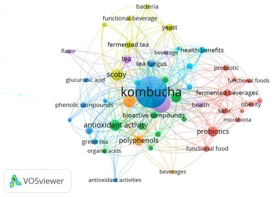 Bibliometric analysis related to co-occurrence of terms “kombucha” and “health” from 2000 to 2025, elaborated with Scopus metadata using VOSviewer 1.6.20 Software.