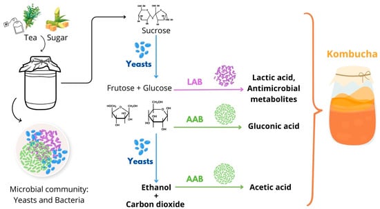 Kombucha is made by fermenting sweetened tea with a Symbiotic Culture of Bacteria and Yeast (SCOBY). From a microbiological standpoint, the primary components of kombucha include acetic acid bacteria (AAB), yeast, organic acids, and other metabolites [6]. Small amounts of lactic acid bacteria (LAB) have been reported in Kombucha, and their role has not been fully studied [6]. Kombucha can be described as a fermented beverage in which the fermentation involves the conversion of sugars (added to the tea infusion) into ethanol by yeasts and acetic acid by the AAB. Yeasts, part of the SCOBY consortium, metabolize sucrose into glucose and fructose, which are then metabolized into ethanol. AAB convert ethanol into acetic acid, which decreases pH, thereby giving kombucha its characteristic sour taste [6,12]. In addition, yeasts produce carbon dioxide (CO2), which imparts fizzy characteristics to the beverage (Figure 2).