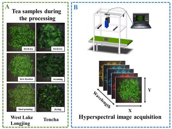 The experimental flowchart of the overall hyperspectral study design. (A) Tea samples used for HSI data collection; (B) HSI system and obtained data cube.