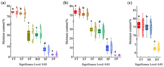 Moisture content variation in different varieties during various processing procedures. (a) Longjing 43; (b) Quntizhong; (c) Jiukeng. FT, fresh tea; ST, spreading; FF, first fixation; RH, rehydration; SF, second fixation; FP, final panning; SS, steaming; DT, drying. Different lowercase letters (a–f) among groups mean statistically significant differences (p < 0.05).