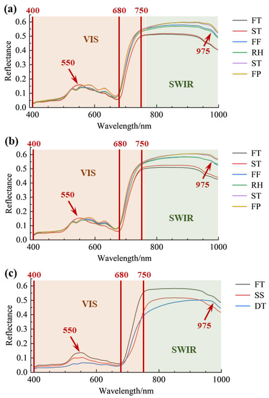 Average spectra of the three varieties during various processing procedures. (a) Longjing 43; (b) Quntizhong; (c) Jiukeng. FT, fresh tea; ST, spreading; FF, first fixation; RH, rehydration; SF, second fixation; FP, final panning; SS, steaming; DT, drying.