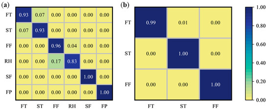 Confusion matrix of the prediction set for the optimal classification model. (a) West Lake Longjing; (b) Tencha. FT, fresh tea; ST, spreading; FF, first fixation; RH, rehydration; SF, second fixation; FP, final panning; SS, steaming; DT, drying.