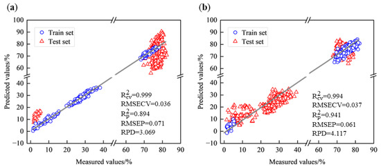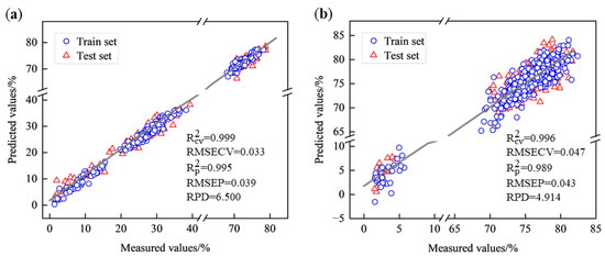 Scatterplot of PLSR model for different types of green tea. (a) West Lake Longjing; (b) Tencha.