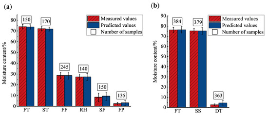 Histograms of measured and predicted moisture content of tea leaves of various processing procedures. (a) West Lake Longjing; (b) Tencha. FT, fresh tea; ST, spreading; FF, first fixation; RH, rehydration; SF, second fixation; FP, final panning; SS, steaming; DT, drying.
