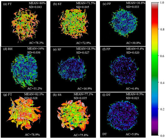 Moisture content distribution of tea in various processing procedures. (a–f) West Lake Longjing; (g–i) Tencha. FT, fresh tea; ST, spreading; FF, first fixation; RH, rehydration; SF, second fixation; FP, final panning; SS, steaming; DT, drying. ‘MEAN’ and ‘SD’ represent the mean and standard deviation of the predicted moisture content for all pixel points, respectively, and ‘AC’ represents the measured moisture content of the sample.