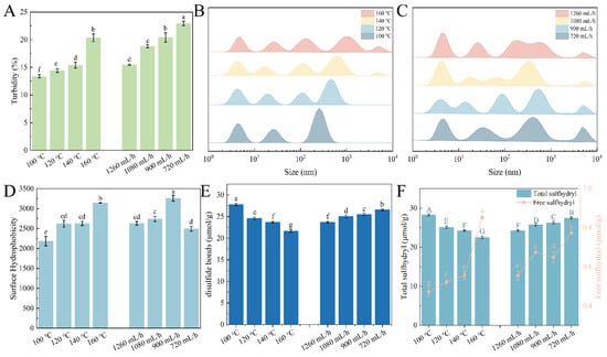 Relationship between inlet temperature and flow rate with physicochemical properties of EWP: (A) turbidity; (B,C) particle size distribution; (D) surface hydrophobicity; (E) disulfide bonds; and (F) total and free sulfhydryl content. The different lower-case letters in (A,D,E) and uppercase letters in (F) respectively indicate the significant differences (p < 0.05) of free and total sulfhydryl content among the samples.