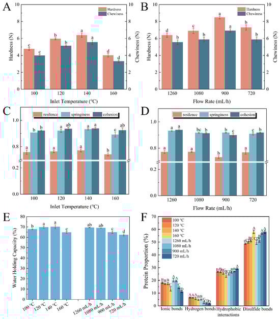 Relationship between inlet temperature and flow rate with gel properties of EWPG: (A,B) hardness and chewiness; (C,D) resilience, springiness, and cohesion; (E) water-holding capacity; and (F) intermolecular force. The different lower-case letters in (A–E) and uppercase letters in (F) respectively indicate the significant differences (p < 0.05) among the samples.