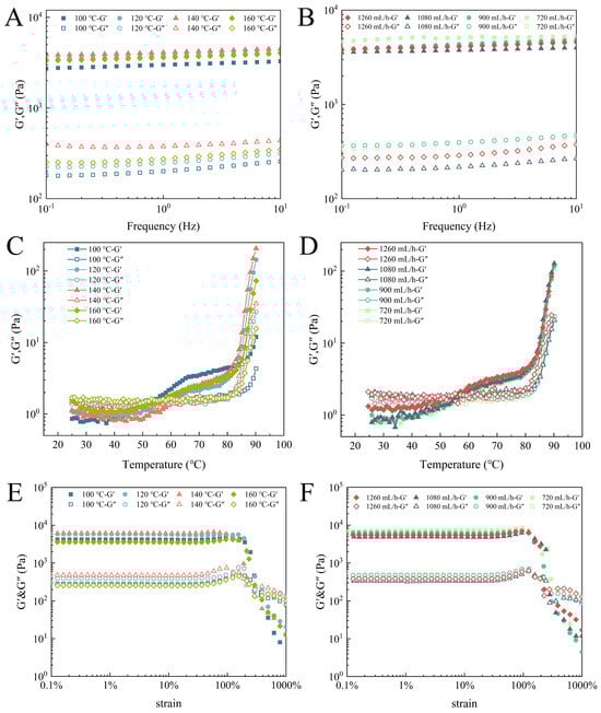 Rheological properties of EWPG: (A,B) frequency sweep; (C,D) temperature sweep; and (E,F) strain sweep.