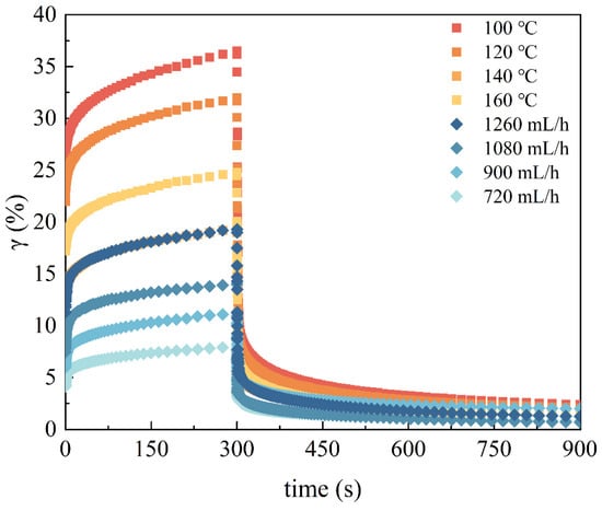 The creep–recovery curve of the EWPG is displayed in Figure 4. A constant stress (300 Pa) was applied to the EWPG, and deformation happened instantaneously (0~0.9 s). And the strain of the EWPG continuously increased over time. The maximum strain of the EWPG varied, where a larger deformation indicated it was softer and easier to stretch. In addition, it was found that the gel could not recover completely as the constant stress was removed, indicating that the viscous component dissipated the deformation energy []. The Burger model was adopted to fit the creep behavior of the EWPG, and all fitting coefficients (R2) were larger than 0.95, suggesting that this model fit the system of the EWPG well. Furthermore, the compliance at the end of creep was maximum compliance (Jmax), which represents the maximum resistance of a sample to strain and reflects the bond strength between the structural units of the sample []. As shown in Table 4, Jmax presented a minimum value at 140 °C and gradually declined with the decreasing flow rate. And the trends of J0 and J1 were consistent with Jmax. The inlet temperature and flow rate were related to the sulfhydryl-binding site exposure of the egg white protein and led to more generation of disulfide bonds during pre-aggregation, resulting in an enhancement in the interactions between protein molecules. When the inlet temperature was too high, the excessive pre-aggregation was detrimental to the formation of a homogeneous network and then led to an increase in the maximum deformation of the gel []. As exhibited in Table 3, the delay time (λ) characterizes the response of a viscoelastic material to an instantaneously applied constant pressure [], where a longer delay time suggests a slower elastic response. As the inlet temperature increased from 100 °C to 140 °C, the value of λ displayed a significant reduction. This result suggested a fast elastic response of the EWPG, which was beneficial for its recovery after deformation. The recovery (R%) of the entire system is expressed as the percentage of the reversible compliance to the maximum compliance []. The results indicate that the produced EWPG had good recoverability with high elasticity and high resistance to deformation.