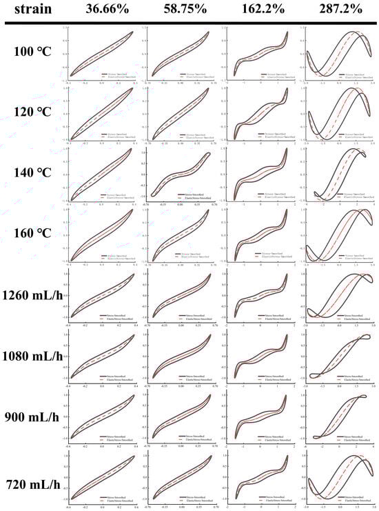 As shown in Figure 5 and Figure 6, Lissajous–Bowditch (LB) curves were applied to analyze LAOS. As shown, when the material had a high elasticity, the elastic LB curve exhibited a straight line or a narrow ellipse shape, and the distortion degree of the curve was linked to the nonlinear response of the stresses []. In these elasticity curves, all EWPG samples presented a narrow elliptical shape at strain (<36.66%), and the decomposition stresses corresponded with the total stresses, suggesting that the EWPG was an elastic linear material. In these viscous LB curves, with increasing strain, the slope of the viscous stresses began to change, indicating the coexistence of an elastic linear with a viscous nonlinear contribution. In the strain range of 36~162%, the elastic component of stress achieved a maximum around the slope of γ = ±γ0, which exhibited intra-cycle strain stiffening. This finding documented that the inlet temperature had a significant effect on the intra-cycle strain stiffening. This behavior first appeared at 36.66% in the EWPG treated within 140 °C and 160 °C. In comparison, the elastic LB curve was more distorted at 140 °C, suggesting a larger contribution from elastic nonlinearity. In contrast, the viscous LB curve was more complicated. As the strain increased, the LB curve gradually transferred from a broad ellipse to a parallelogram or hexagon, and a multi-waveform appeared at a viscous stress component of 58.75%. It can be observed that the EWPG first exhibited intra-cyclic shear thickening near an instantaneous strain rate of zero, followed by intra-cyclic shear thinning. And finally, intra-cyclic shear thickening appeared again near an instantaneous strain rate of the maximum value. This result may have been caused by the generation of some hyper-entanglements in the network structure of the EWPG, where at a low instantaneous strain, these hyper-entanglements gradually yielded and collapsed instantaneously as the instantaneous strain increased. While the whole network was not damaged, shear thickening and shear thinning occurred successively in a cycle. Subsequently, the strain increased near the maximum value, and the whole network was close to yielding, and cyclic shear thickening occurred again []. A similar phenomenon was also observed in the research by Goudoulas and Germann []. When the strain amplitudes were larger than 162%, the LB curve became more complicated, and all curves in the elastic LB curve appeared to be secondary loops, corresponding to self-intersecting and strongly nonlinear viscous responses at large strain amplitudes. This self-intersection phenomenon was also investigated in previous research by Tong et al. [], where high- and low-acyl gellan gum composite systems were determined. This may be due to the fact that the time scale of gel structure restructuring was shorter than that of oscillatory deformation and was related to the faster unloading of transient instantaneous elastic stresses than the accumulation of new elastic deformation [].