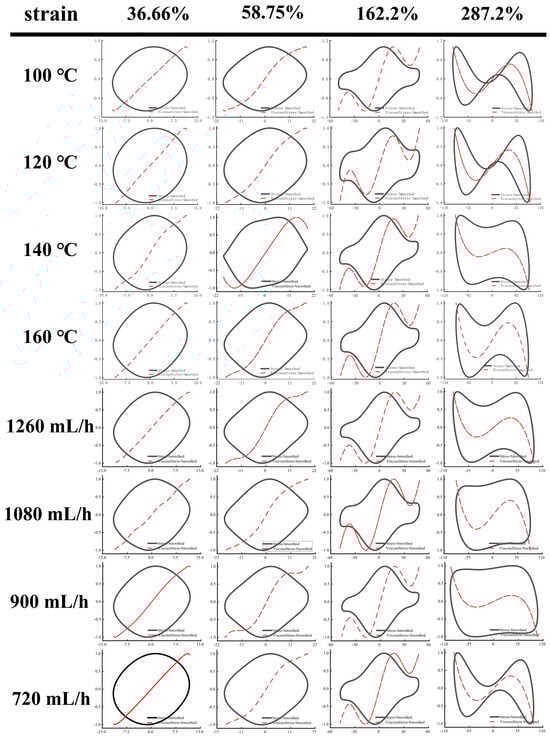 Elastic Lissajous–Bowditch curves of EWPG under different inlet temperatures and flow rates. Note: The black point represents total intracycle normalized stress, and the red line represents normalized stress decomposition. All instantaneous stress values are normalized relative to the maximum stress within the oscillation cycle.