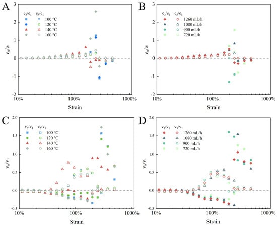 A quantitative analysis of the inter-cycle nonlinearity degree could be determined by evaluating the Chebyshev coefficient ratios. As displayed in Figure 7, as the strain was not sufficient for yielding, the ratio of e3/e1 presented an increasing tendency, suggesting that before the network broke down, there was a continuously growing strain-stiffening response []. Before yielding, all e3/e1 values were well fitted, and the higher-order elasticity ratio (e5/e1) was not changed in the yield strain range; therefore, it could be demonstrated that the stiffening characteristic was driven by the third-order nonlinear harmonic []. At the yield point, the ratio of e3/e1 was less than zero and gradually approached zero, presenting a gradual weakening of the strain-softening response, indicating gel network fragmentation. The viscous Chebyshev coefficient ratios (v3/v1) were near zero in a linear state. However, as the strain amplitude increased from SAOS to LAOS, the ratio of v3/v1 was less than zero, while v5/v1 was larger than zero, indicating that the intro-cycle shear-thinning property of the EWPG was dominantly affected by higher-order nonlinear viscous harmonics []. These results demonstrate that the inlet temperature had a significant effect on the higher-order nonlinear response of the EWPG, where the shortest linear viscoelastic zone and strongest higher-order viscous nonlinear properties appeared in the EWPG at 140 °C, and its elastic nonlinear response was weaker.