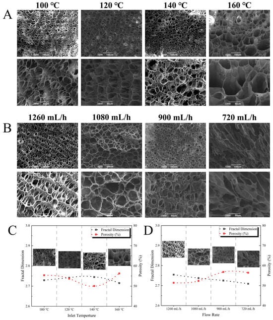 (A,B) Scanning electron microscopy; (C,D) porosity and fractal dimension of EWPG under different inlet temperatures and flow rates.