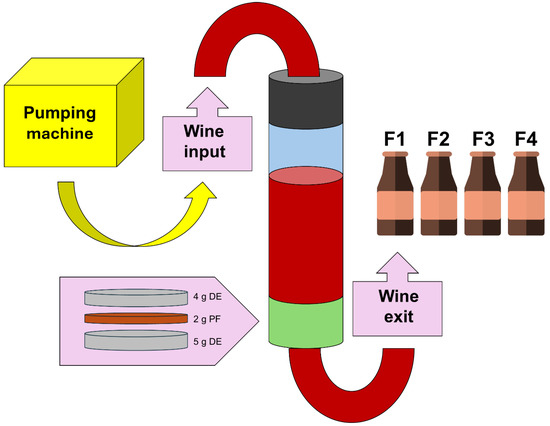 A young Monastrell wine provided by Bodegas Salzillo (Jumilla, Spain), with a pH of 3.92, alcohol content of 13.5% and a total acidity of 4.5 mg/L, was spiked with OTA (4 µg/L), histamine (10 mg/L), and 7 pesticides, 6 fungicides, and 1 insecticide (Table 1). The wine was passed through a filter in a column composed of diatomaceous earth (Radifil RP, Agrovin S.A, Alcazar de San Juan, Ciudad Real, Spain) (9 g) and the tested fibre (Figure 1). The wine was pushed through the column by a pump machine at a flow rate of 25 mL/min. For each treatment, 1 litre was used, and four fractions of 250 mL were collected during the filtration process (F1, 2, 3, and 4). After the fining treatment, the wine was filtered (0.45 µm nylon) before analyses.
