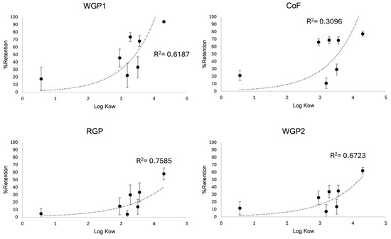 Effects of log Kow on pesticide removal during the fining of a red wine through a continuous filtration system using different plant fibres. Abbreviations: WGP1, white grape pomace fibre 1; WGP2, white grape pomace fibre 2; RGP, red grape pomace fibre; CoF, commercial fibre.